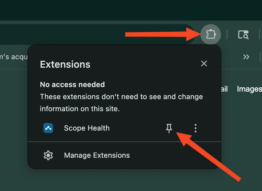 - Pin the extension to your toolbar by clicking the puzzle piece icon and selecting the pin next to Scope Health