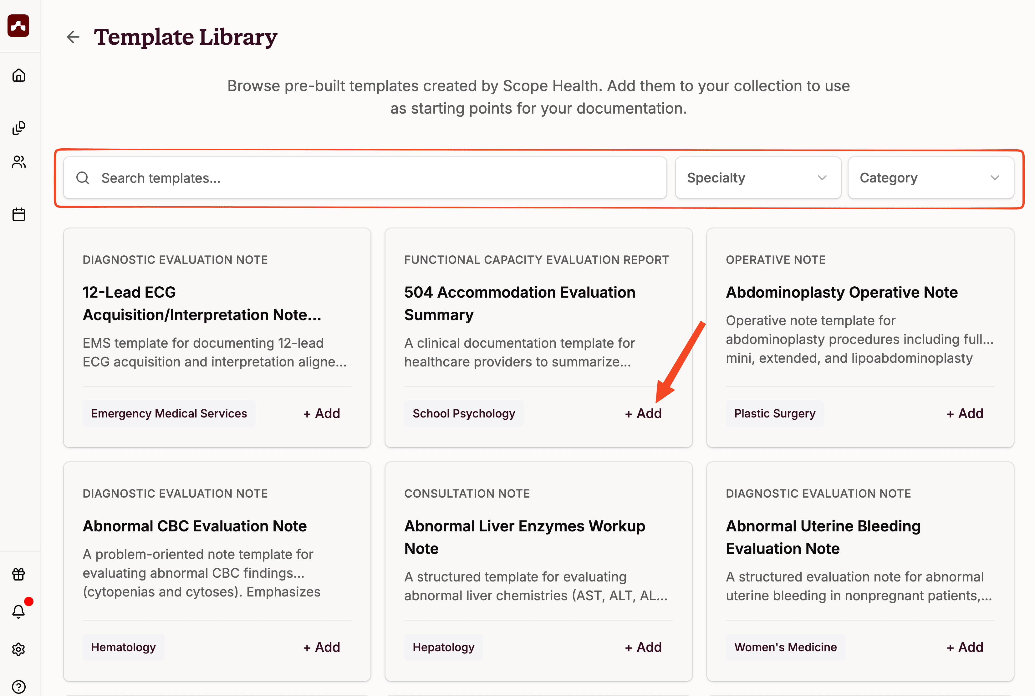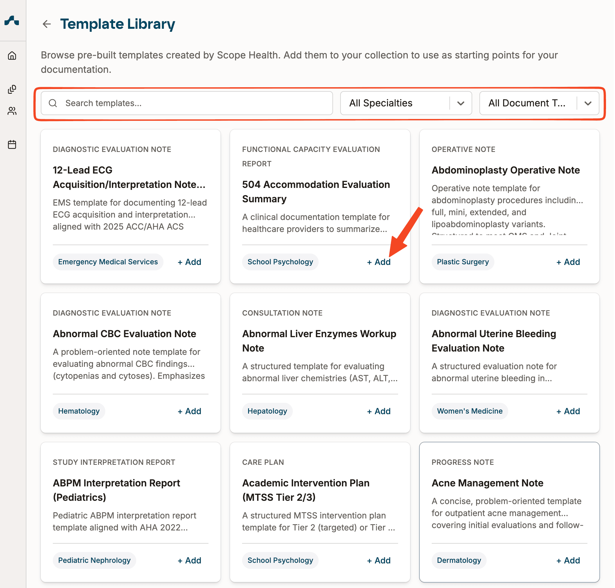 Scope Health provides a comprehensive library of professionally-designed clinical documentation templates, ready to use across every medical specialty.